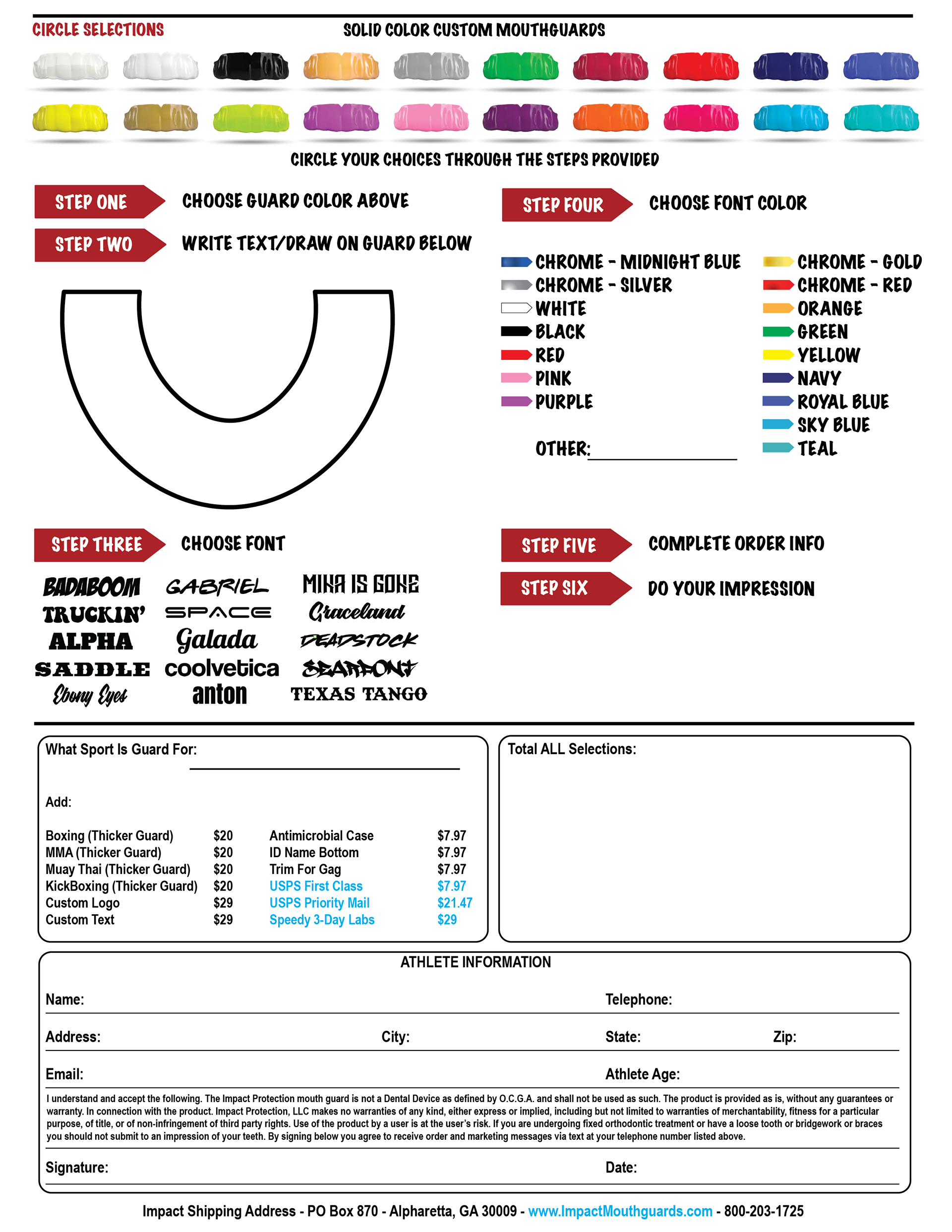 Spreadsheet for customers to select the type of mouthguard they are interested in at live events.